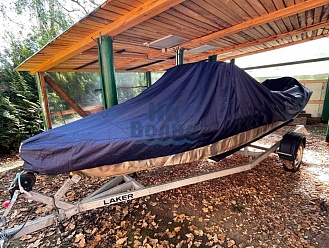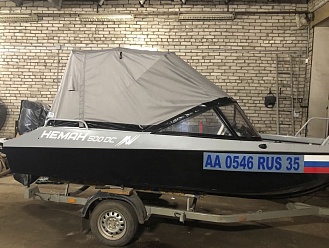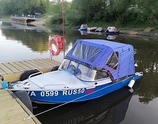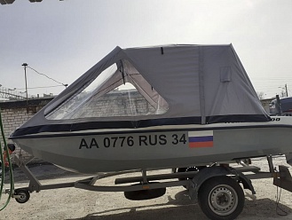 Тент с задней дверью для выхода к мотору, небольшими боковыми окнами и усиленными краями для установки застёжек. Изготовлен из специализированной тентовой ткани Оксфорд 600 повышенной плотности